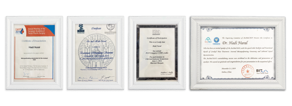 He is lecturing in national and international meetings about surgical and nonsurgical facial treatment. His innovation technic in crooked nose treatment ‘’ Aesthetic and functional result of crooked nose treatment; internalmicroperforating osteotomy and subtotal septal reconstruction’’ is published in European Journal of Plastic Surgery and presented at Annual meeting of the European Facial Plastic Surgery 2019 in Amsterdam. In addition, he developed a groundbreaking technique of facelift and his academic study on this technique, which “Vertical Space Lift: Transcutaneous Lower Blepharoplasty, Subperiosteal Midface Lift, and Lower Face Lift: A Novel Technique of Buccal Fat Suspension to Medial Infraorbital Rim.”, has been published on Aesthetic Surgery journal.